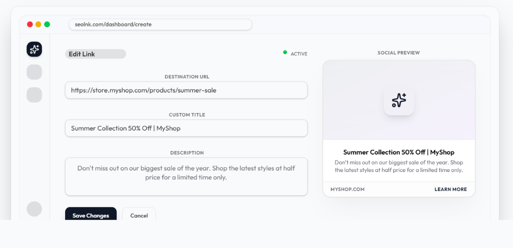 Edit your link details and watch the social preview update in real-time. What you see is what your audience gets.
